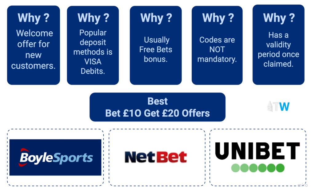 Bet £10 Get £20 offers have been very popular as of late in the UK sports betting industry, with many of the leading bookmakers throwing their hat into the mix. Learn which bookmakers are currently offering this bonus style in our guide: we have hard-tested and verified the best Bet £10 Get £20 offers available in the UK.