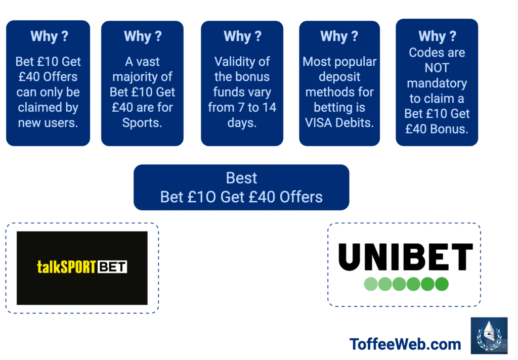 - Bet £10 Get £40 offers are typically provided in the form of Welcome Bonuses which can only be claimed by new customers joining the site.