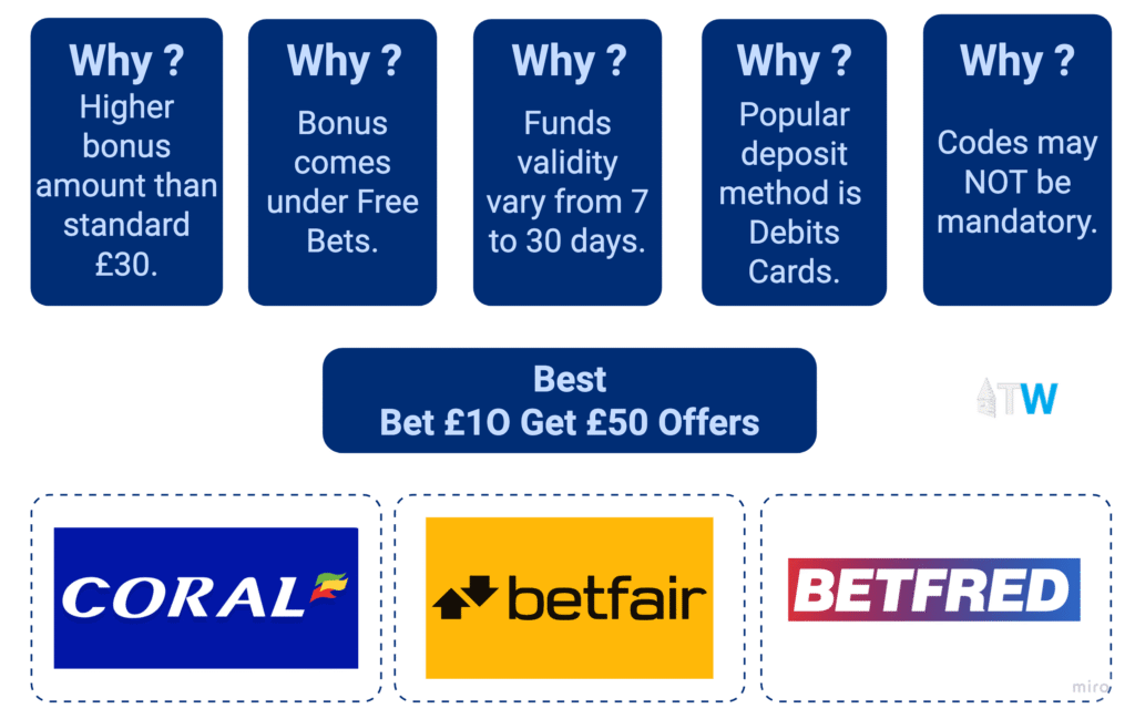Bet £10 Get £50 offers represent the highest-value ‘bet & get’ deals available in the UK. We’ve personally tested and verified these offers for you, from top bookmakers like Betfair and Betfred. We’ll show you exactly how to claim these generous deals and make the most of your £10 stake.