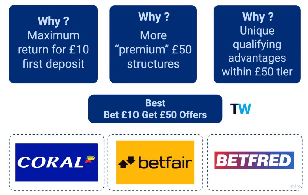 - Top-of-page maximum return for £10: these are the only offers that turn a £10 qualifying bet into £50 (a 5× bonus-to-stake ratio), higher than any bet £10 get £20/£30/£40 deal.