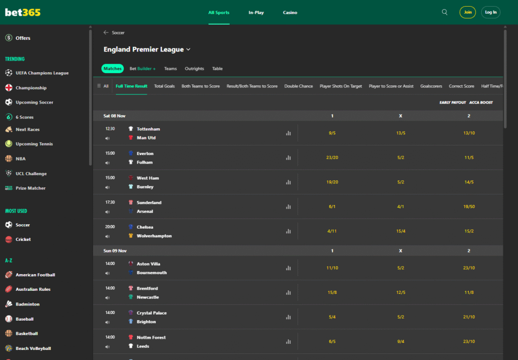 How bet365 covers the English Premier League was found to be amongst the best in the industry, with live betting offered on almost every single 2025/2026 matchup. Our evaluation of the betting odds also came out to a positive conclusion, with most markets offering slightly above average odds for the EPL.
