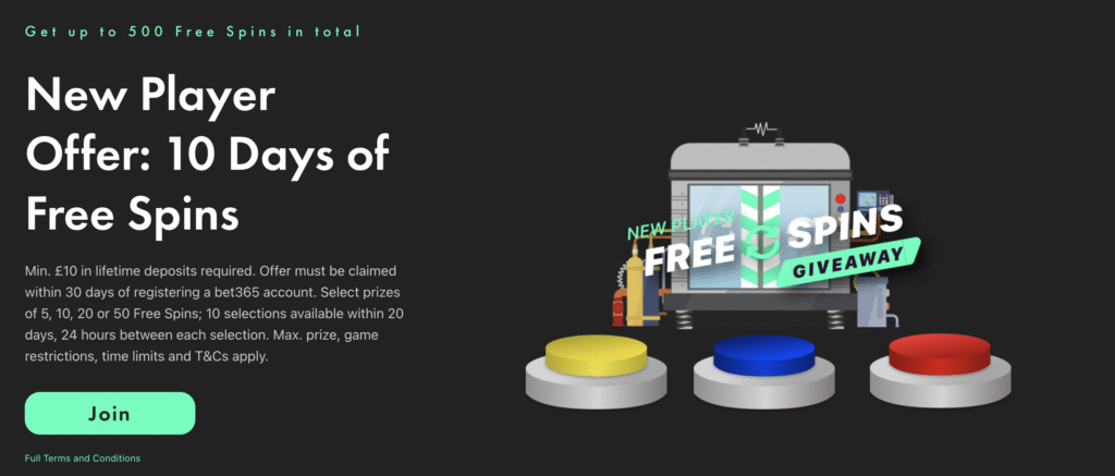 You’ll have 10 opportunities to select your Free Spins over a 20-day period, with one selection available every 24 hours. Remember to claim the offer within 30 days of registering your Bet365 account to ensure you don’t miss out.