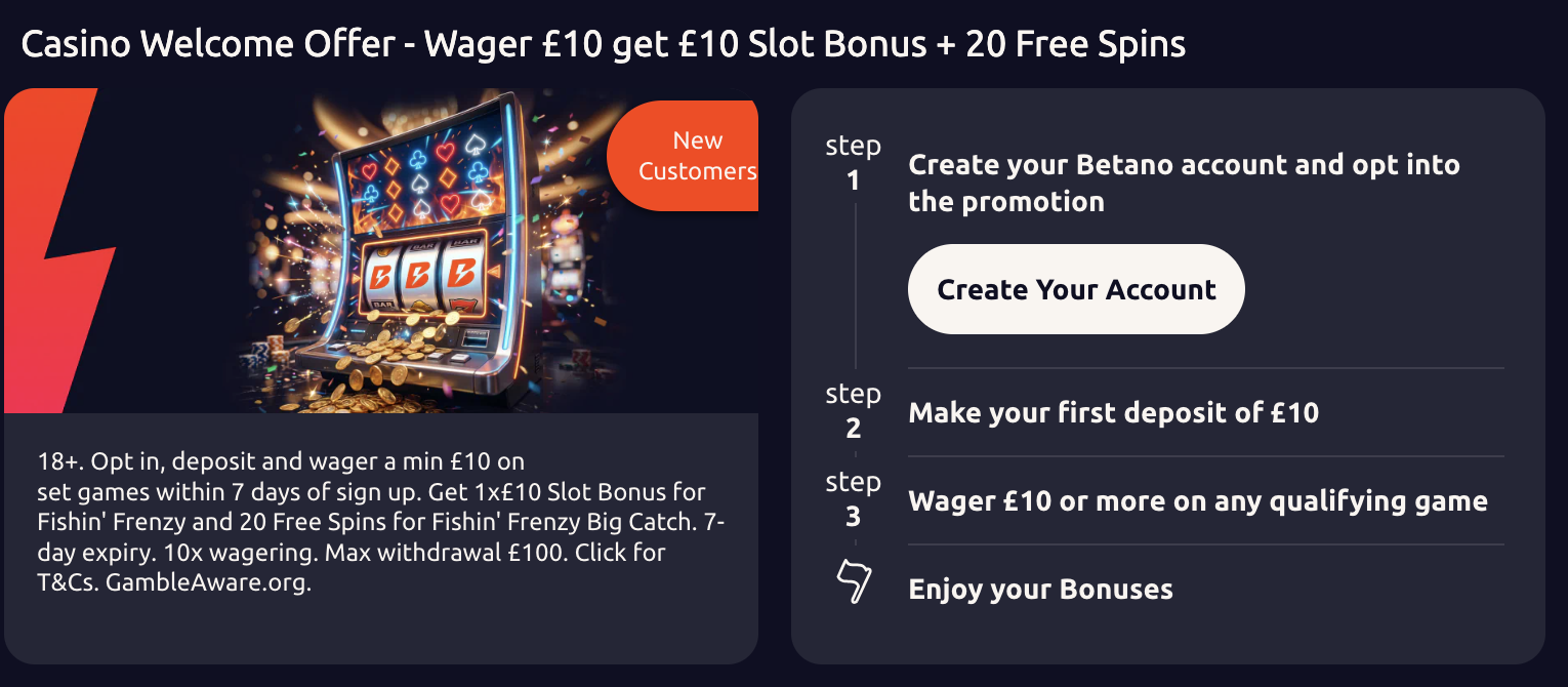 New users can claim the Betano registration bonus: Bet £10 Get £30 in free bets. This is a sports-focused bonus for new Betano customers.