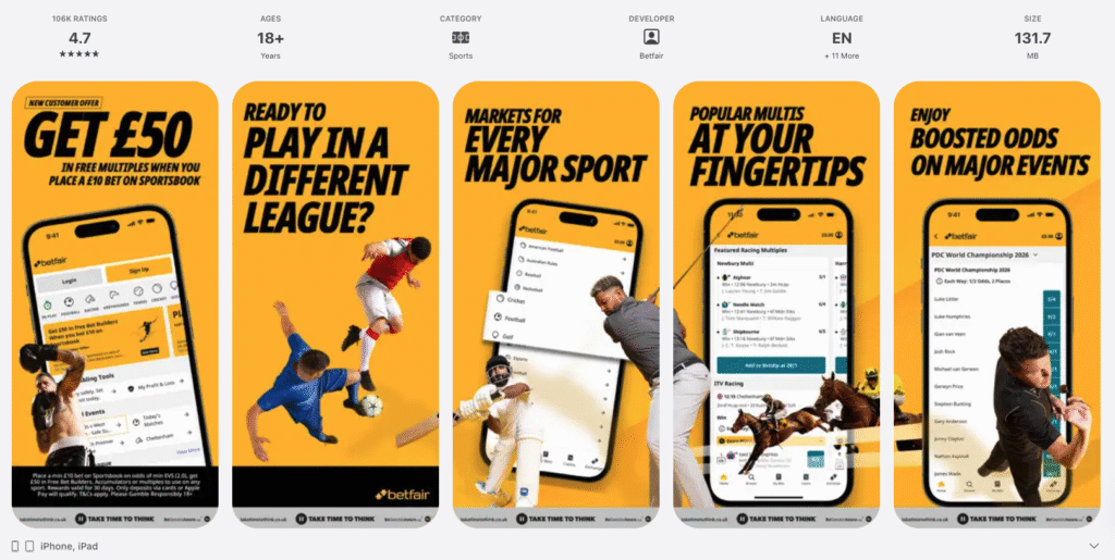 The app offers a wide range of sports markets (football, horse racing, tennis, and more), live in‑play betting, live streaming for many events, and features like “Cash Out.” You also have access to Betfair’s sportsbook and betting exchange depending on the app version you choose.