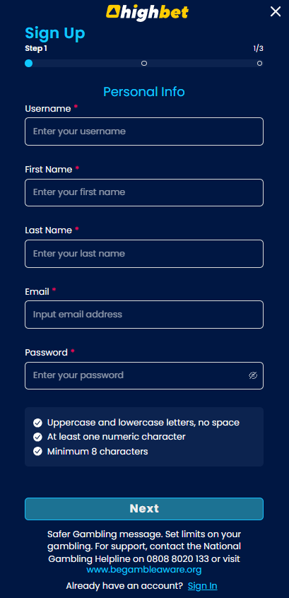 - Click here to launch the registration process at Highbet.