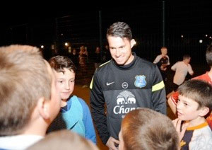Season › 2013-14 › News Oviedo Kicks In With Kirkby Youngsters , 13 December, 0comments | Jump to most recent Bryan Oviedo put his footballing skills to the test against local young people at the official launch of Everton in the Community’s Kicks project in Kirkby on Tuesday. The Costa Rican international took time out from preparing for this weekend’s home game against Fulham to meet youngsters at their weekly football coaching session with the Blues official charity. The programme has recently launched in Kirkby to offer free football coaching in a bid to reduce crime and anti-social behaviour across the borough. Four evenings a week, Everton in the Community coaches engage with hundreds of local young people as they visit community centres in Westvale, Towerhill, Southdene and Northwood. Youngsters at Westvale Community Centre were delighted to welcome Oviedo to their weekly session, where he took part in a series of shooting, dribbling and passing drills. Oviedo, whose national team was drawn in the same group as England at next summer’s World Cup, said: “It’s been great to come along tonight and meet all the kids. It’s really important that we get out in the community to support projects like this and Everton in the Community are clearly making a massive difference to the lives of the young people here. “The kids were all asking me about the World Cup draw and how well Everton are playing at the moment so it was nice to speak to them and join them in their coaching session. “Too often young people stay home and play on their computer games or can get involved in trouble so projects like this make a difference to the whole community, and their health and fitness.” Kicks is delivered in partnership with Knowsley Council, Your Housing Group, Liverpool Housing Trust and Merseyside Police youth engagement team. The organisations work alongside each other to signpost young people who are in danger of getting involved in anti-social behaviour. As well as football coaching, participants in the Kicks project have the opportunity to gain a vocational-based qualification through completing various challenges and putting together a portfolio of evidence to demonstrate their abilities and life skills. Knowsley’s Cabinet Member for Leisure, Community and Culture, Cllr Eddie Connor, said: “Everton in the Community’s football coaching sessions have been a huge success, providing positive activities for local young people and helping them develop their soccer skills. We’re delighted that Everton is now supporting the Kicks programme which will offer even more great opportunities to local youngsters.” About these ads © ToffeeWeb