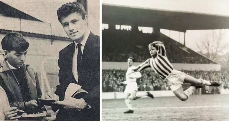 Left: Giving an autograph to a Bright and Hove Albion supporter after joining in 1963; Right: Taking flight for the Seagulls