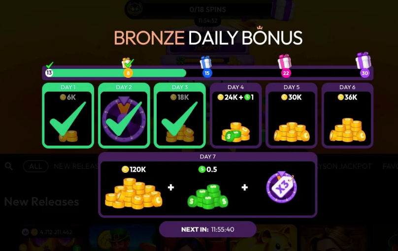 Daily login streak155,000 GC + 2.8 SC (7 days)Progressive rewards
